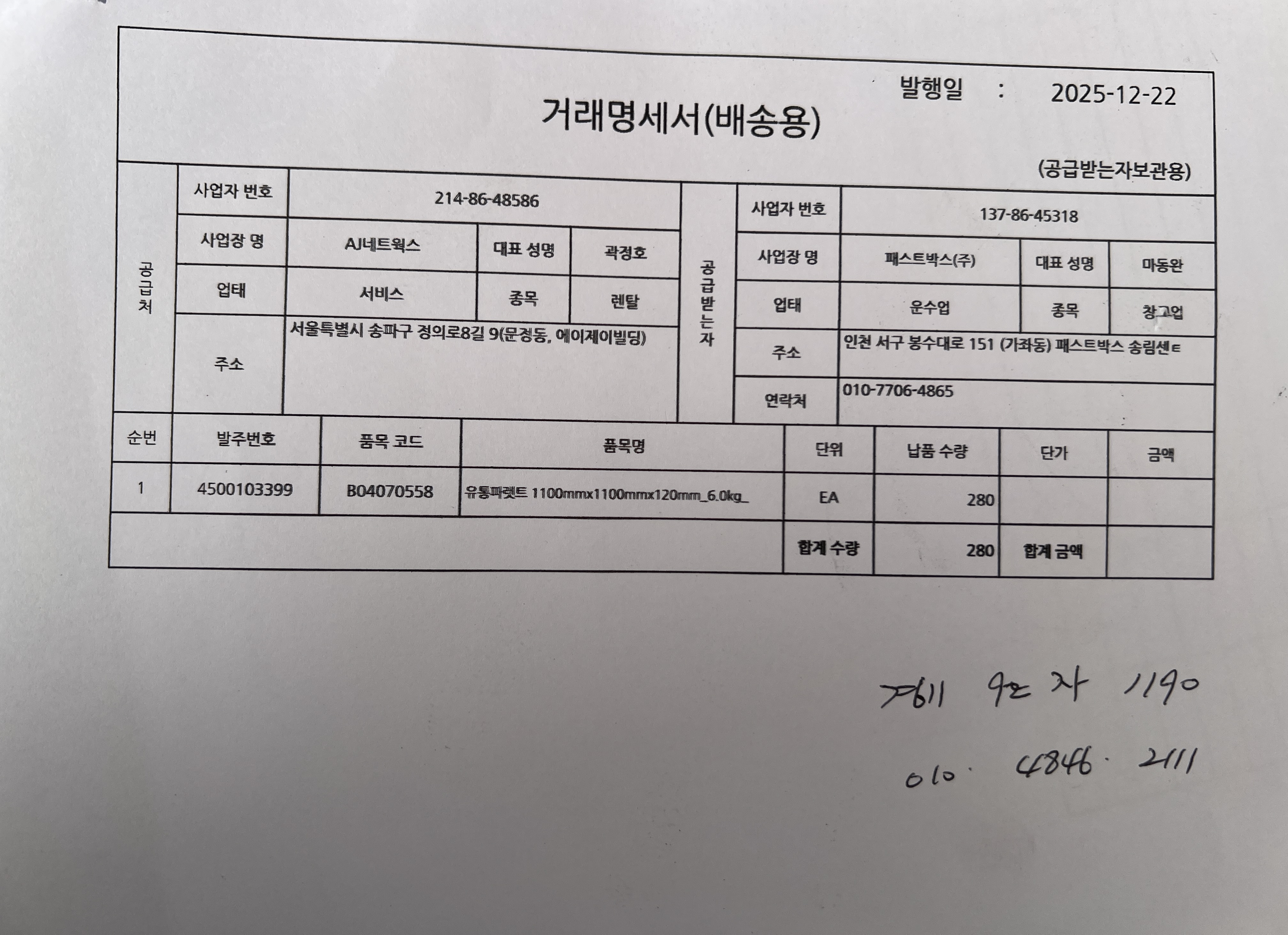 #1. 수출용파렛트 / 수량 : 280 / 규격 : 1100*1100