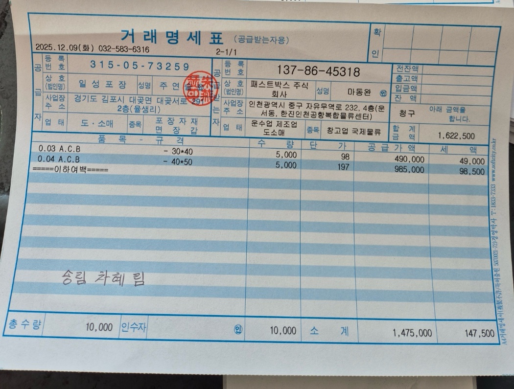 #3. 에어봉투3/30/40 / 수량 : 5,000 / 규격 : 0.03*30*40